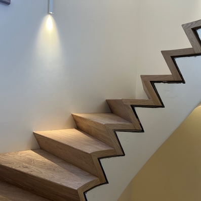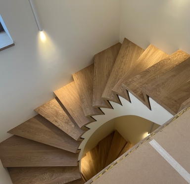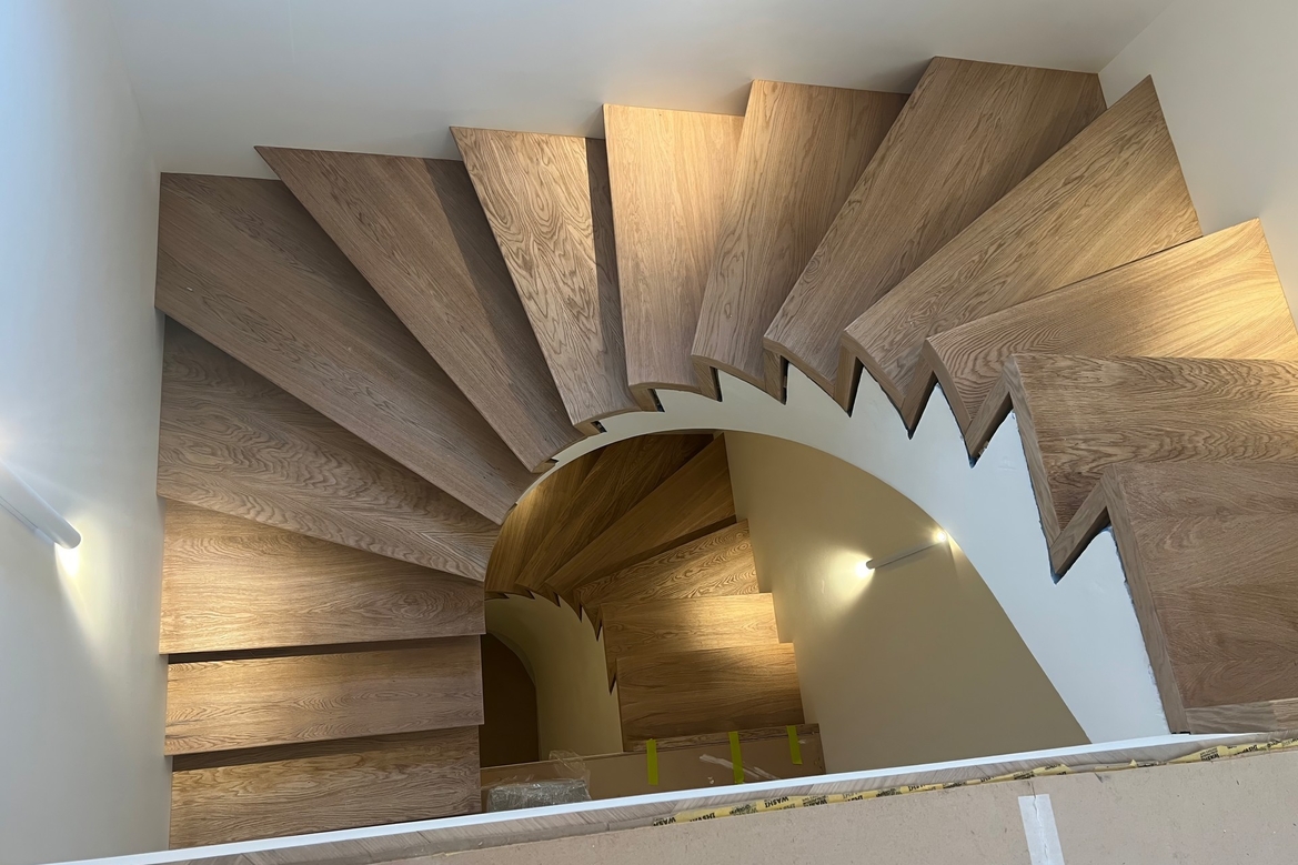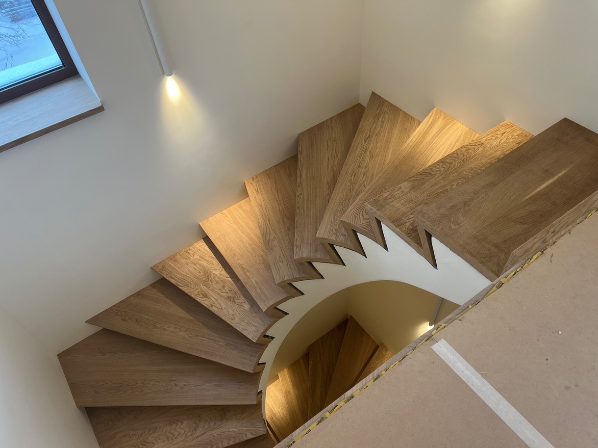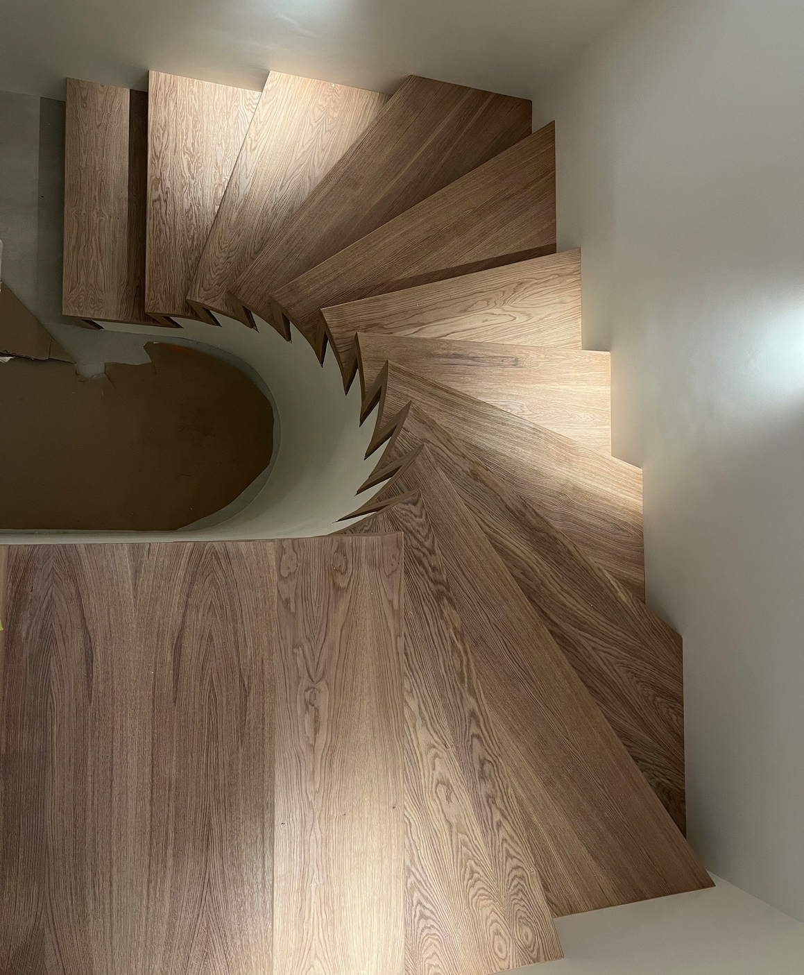 Особенность винтовых лестниц в том, что здесь практически не существует повторяющихся элементов. Каждая ступень имеет свой угол, свою ширину и свою линию сопряжения с радиусом лестницы. Поэтому любые решения, которые работают на прямых маршах, здесь начинают давать проблемы. Именно поэтому для этого проекта было выбрано инженерное решение: ступени на стабилизированной фанерной основе с облицовкой натуральным шпоном дуба.