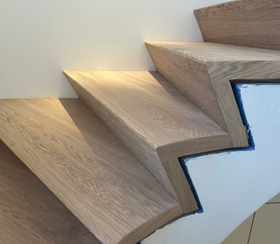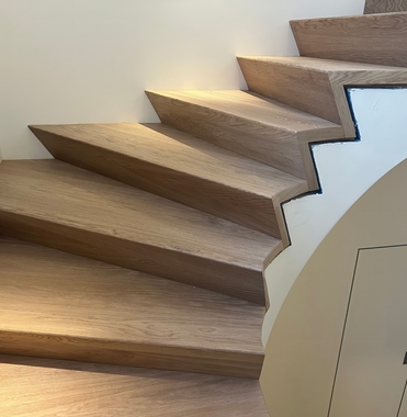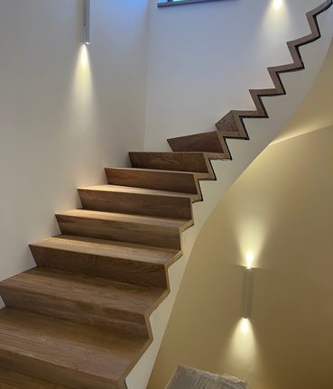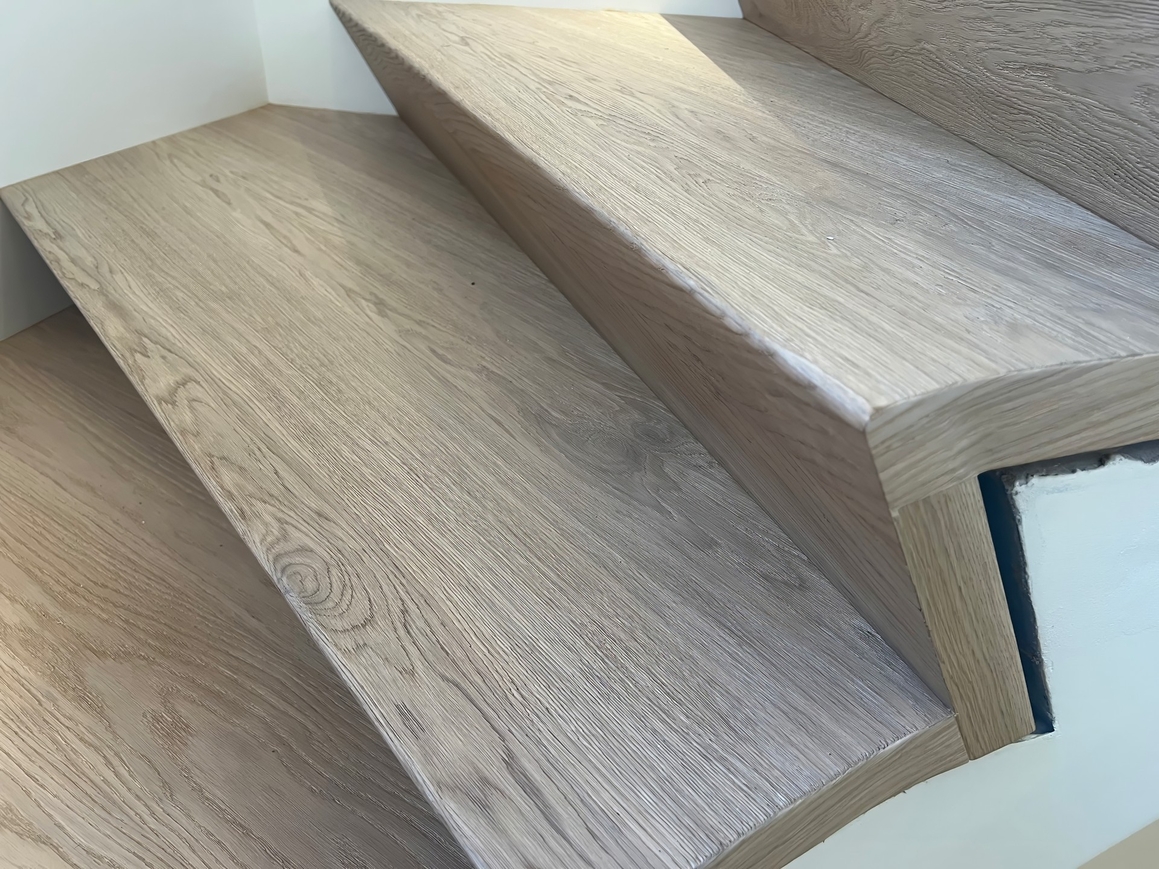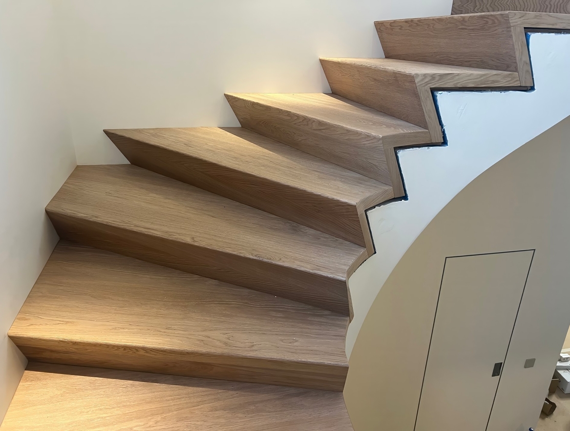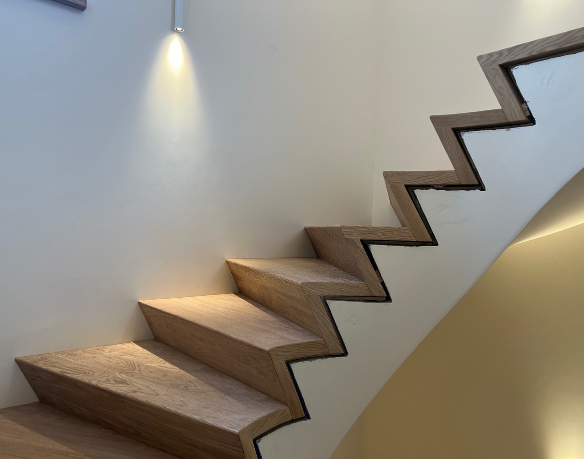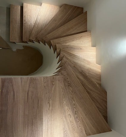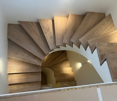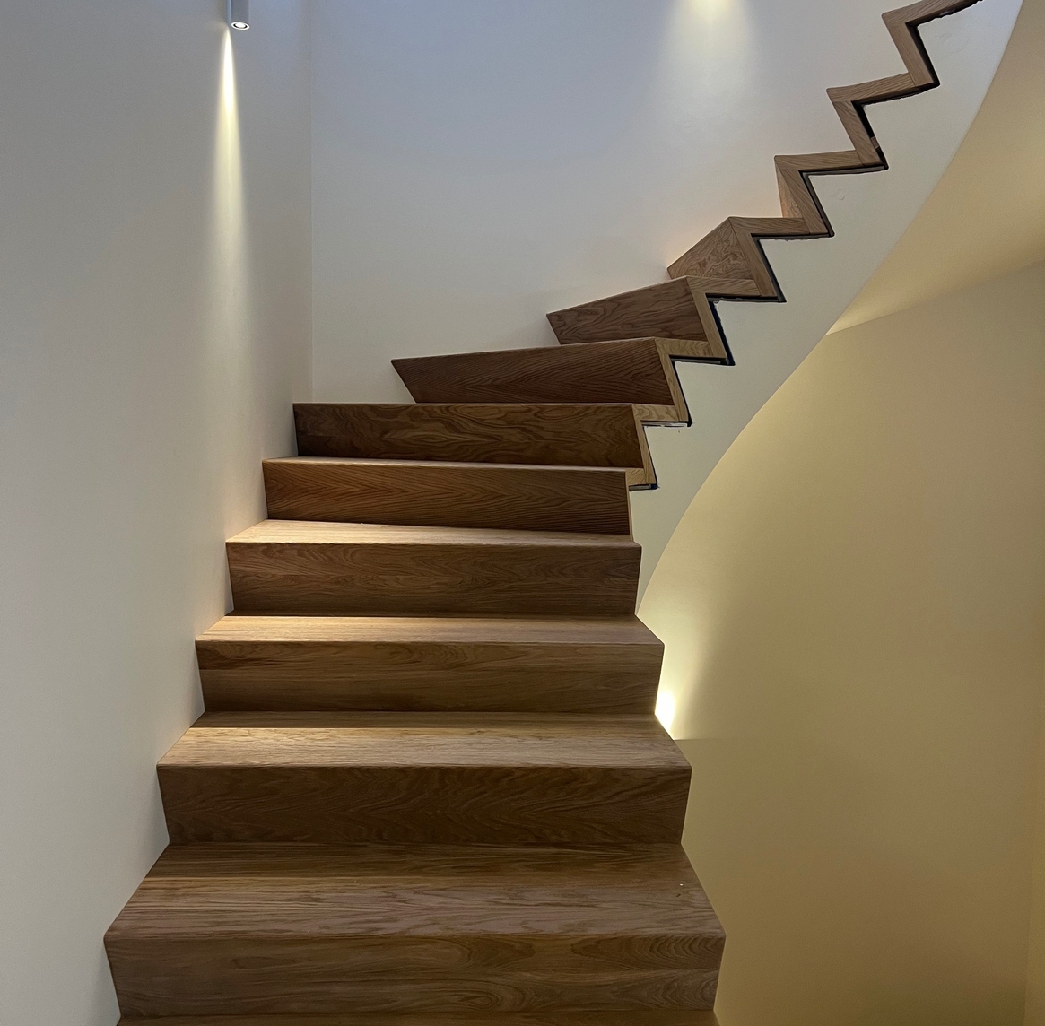 Это винтовая бетонная лестница с 4 маршами без площадок, где обшивка выполнена как инженерная система. Единые Г-образные ступени толщиной 40 мм, основа из высокопрочной фанеры, шпон дуба 4.5 мм, термопресс и PUR-клей, функциональное браширование в зоне шага, многослойная система финиша. Основание выполнено через полимерную гидроизоляцию и фанеровку каркаса 10 мм, что одновременно решает изоляцию и выравнивание. Самый сложный узел, внешний зуб ступени, сделан через скругление и цельный переход шпона без стыков и накладных торцов.