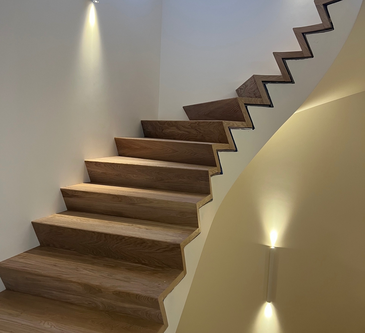 В этой статье подробно разберём, как именно решалась эта задача: от подготовки бетонного каркаса и формирования геометрии ступеней до финальной обшивки шпоном дуба.