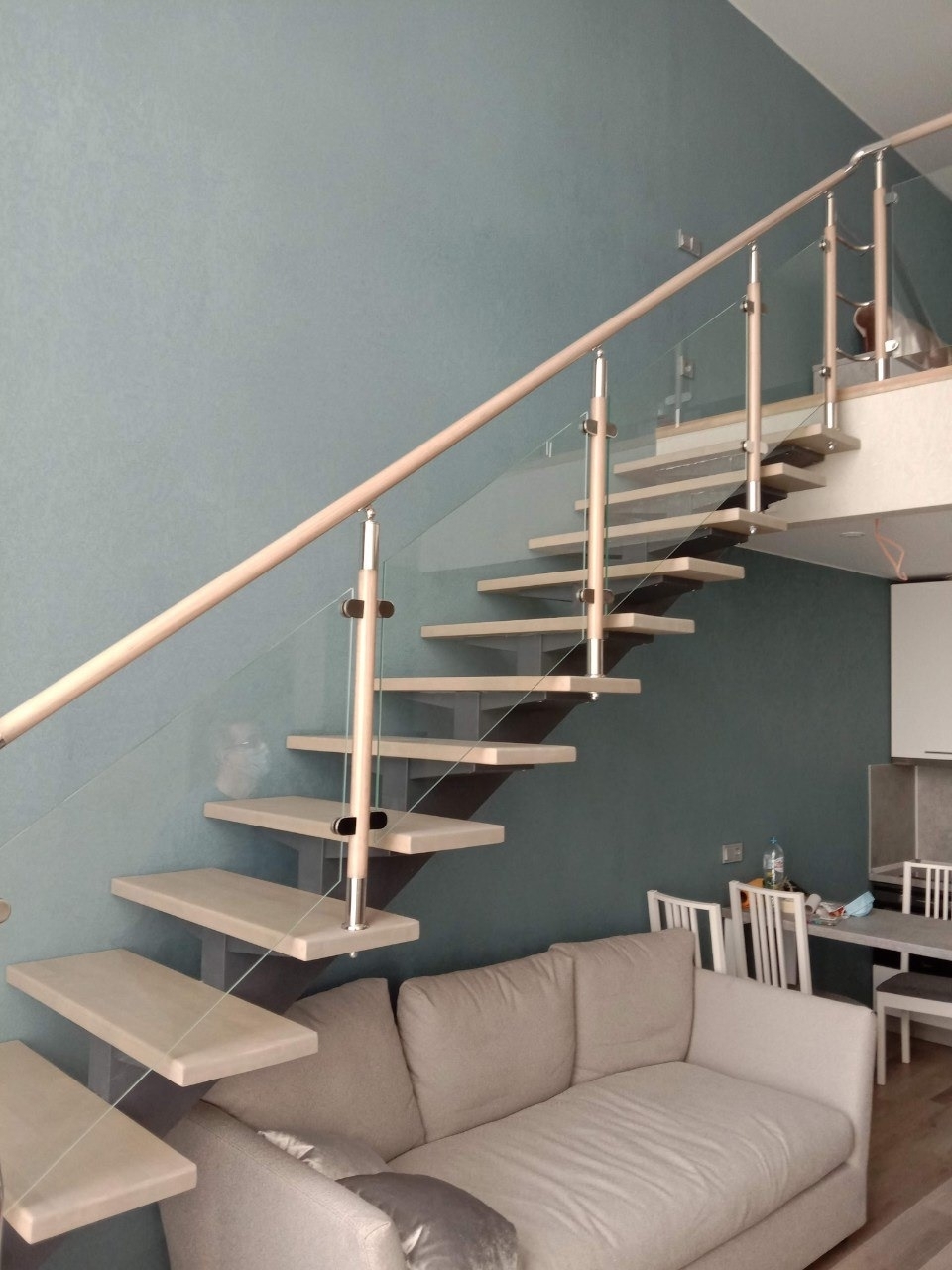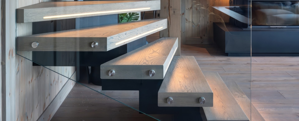 В таком пространстве лестница легко может стать визуально тяжелой. Особенно если накидать стойки, металл, лишние ребра, лишние линии.