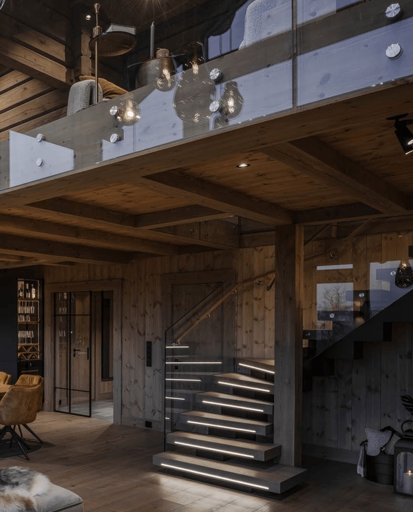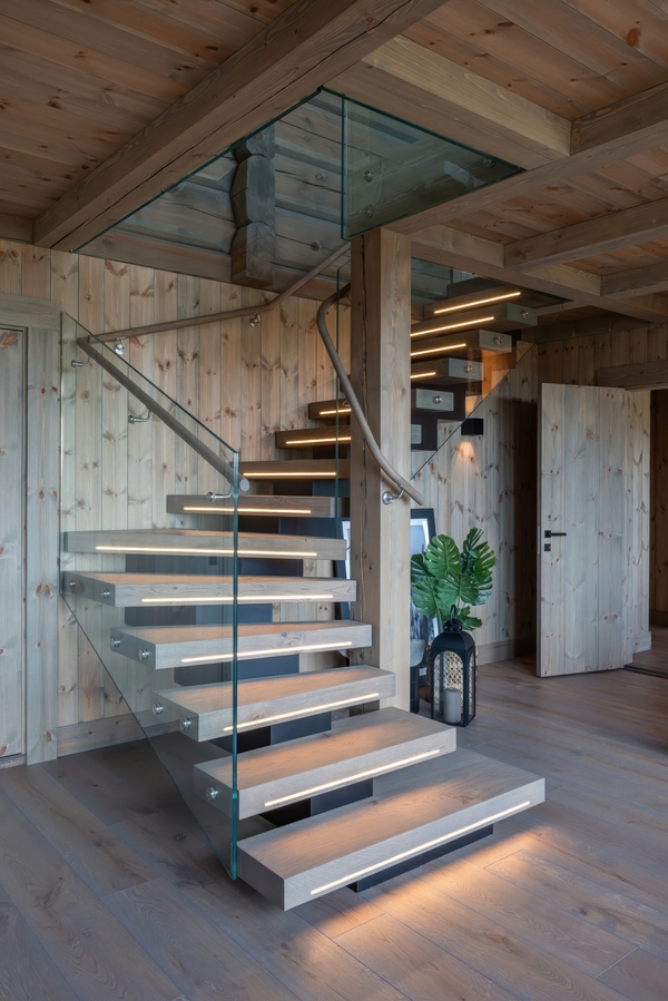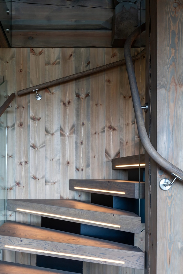 - визуально сделать лестницу легкой, почти парящей, чтобы она не спорила с домом из бруса, а дополняла его