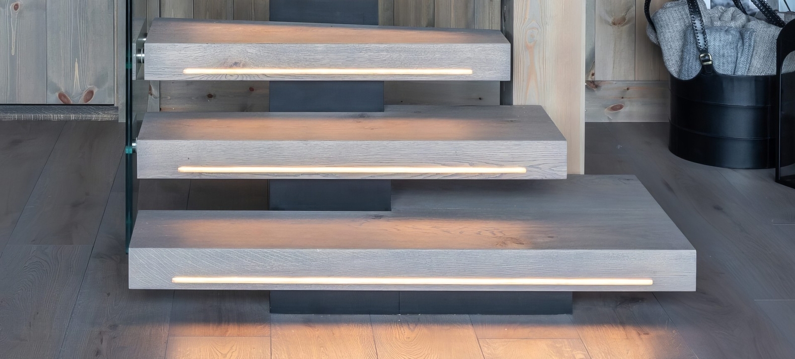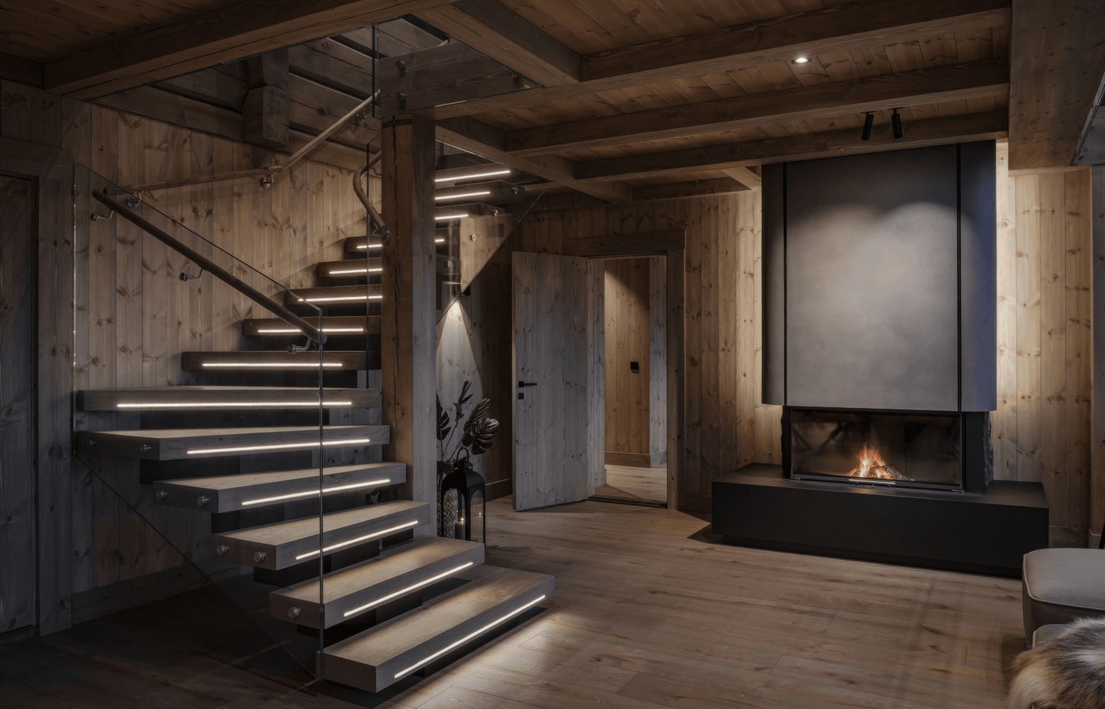 Отсюда и вся логика проекта: монокосоур, закрытые площадки, короба-ступени, стекло на точках, подсветка, минимум видимого металла.